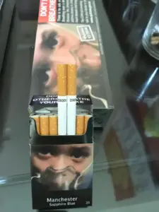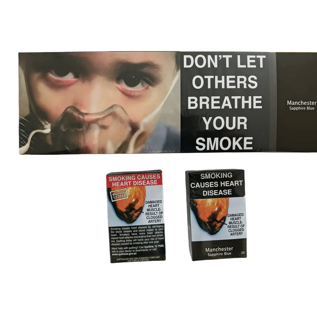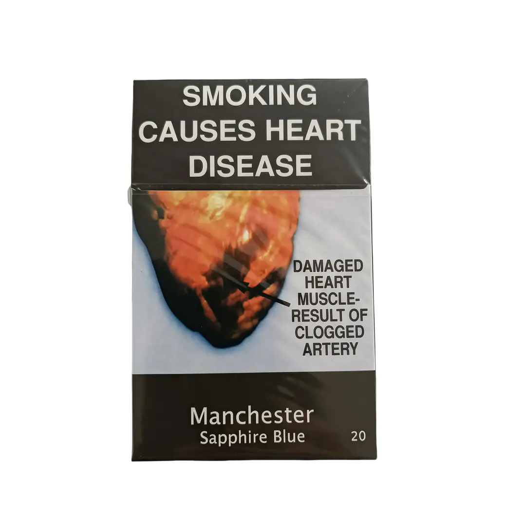 | Packaging | Black hard pack with mandatory graphic health warnings, “Manchester Sapphire Blue” labeling |